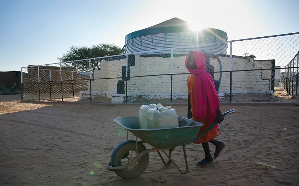 Mit einer Schubkarre schafft Sana Kanister mit Trinkwasser heran. Die füllt sie zu Hause in eine Plastiktonne. Fließendes Wasser gibt es nicht.