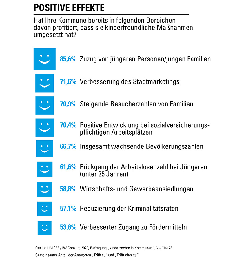 Steigende Besucherzahlen, eine positive Entwicklung von sozialversicherungspflichtigen Arbeitsplätzen sowie eine Verbesserung im Stadtmarketing sehen jeweils 71 Prozent der Kommunen als positive Effekte durch die Umsetzung von kinderfreundlichen Maßnahmen.