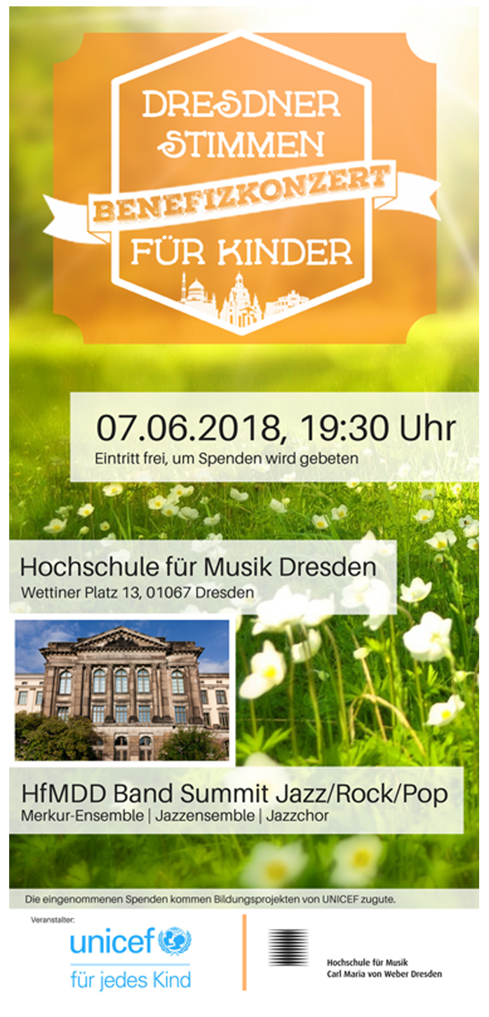 Die UNICEF-Arbeitsgruppe Dresden lädt zu ihrem jährlichen Benefizkonzert "Dresdner Stimmen für Kinder" am Donnerstag, dem 07. Juni 2018, in die Hochschule für Musik Carl Maria von Weber Dresden ein. Der Eintritt ist frei, um Spenden wird gebeten.