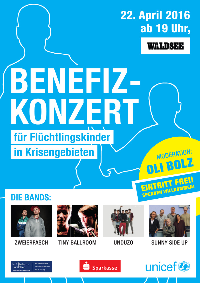 Die vier Bands (im Bühnenbild von links) Tiny Ballroom, Zweierpasch, Undozo und Sunny Side Up engagieren sich für die UNICEF-Flüchtlingshilfe in Krisengebieten und gestalten unentgeltlich einen abwechlungsreichen Konzert-Abend. Oli Bolz wird durch das Programm führen. Der Eintritt ist frei.